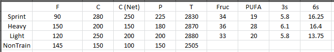 On my heavy days when I'm doing the low rep stuff I'll be getting about half my cals from fat, 25% from carbs, 25% protein, for the reasons stated above. On sprinting days I knock the fat back a bit and up the carbs a good deal; by the end I'm depleting glycogen like crazy, especially on the 200s. I also bump up the protein because of how much damage I'm inflicting on my posterior chain. On my 'light' day in the gym, which would be things between 5 and 8 rep sets, I'm going to be around 200g of carbs net, lower fat, and slightly higher protein since I'm inflicting a bit more muscle-trauma than on the heavy days. Here's how things like PUFAs (and omega-3s & oemga-6s), and fructose shook out, as well as what my targets were for each day for macros: